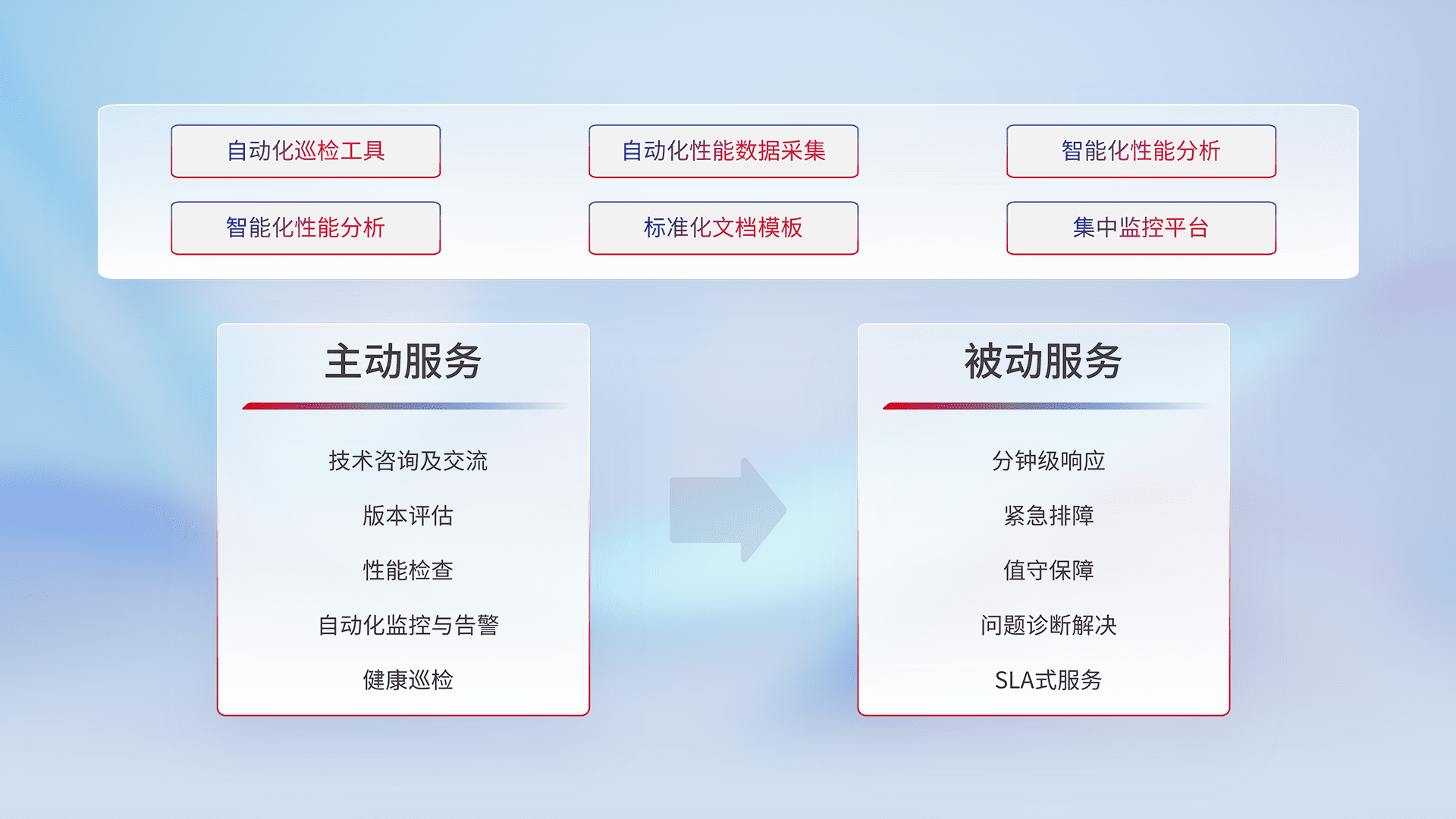 智能化工具和标准化文档,,,保障服务质量,,,,提供主动服务(包含技术咨询、、、、版本评估、、、性能检查、、自动化监控与告警、、、、健康巡检)和被动服务包含(分钟级响应、、、、紧急排障、、、、值守保障、、问题诊断解决、、、SLA服务)。。