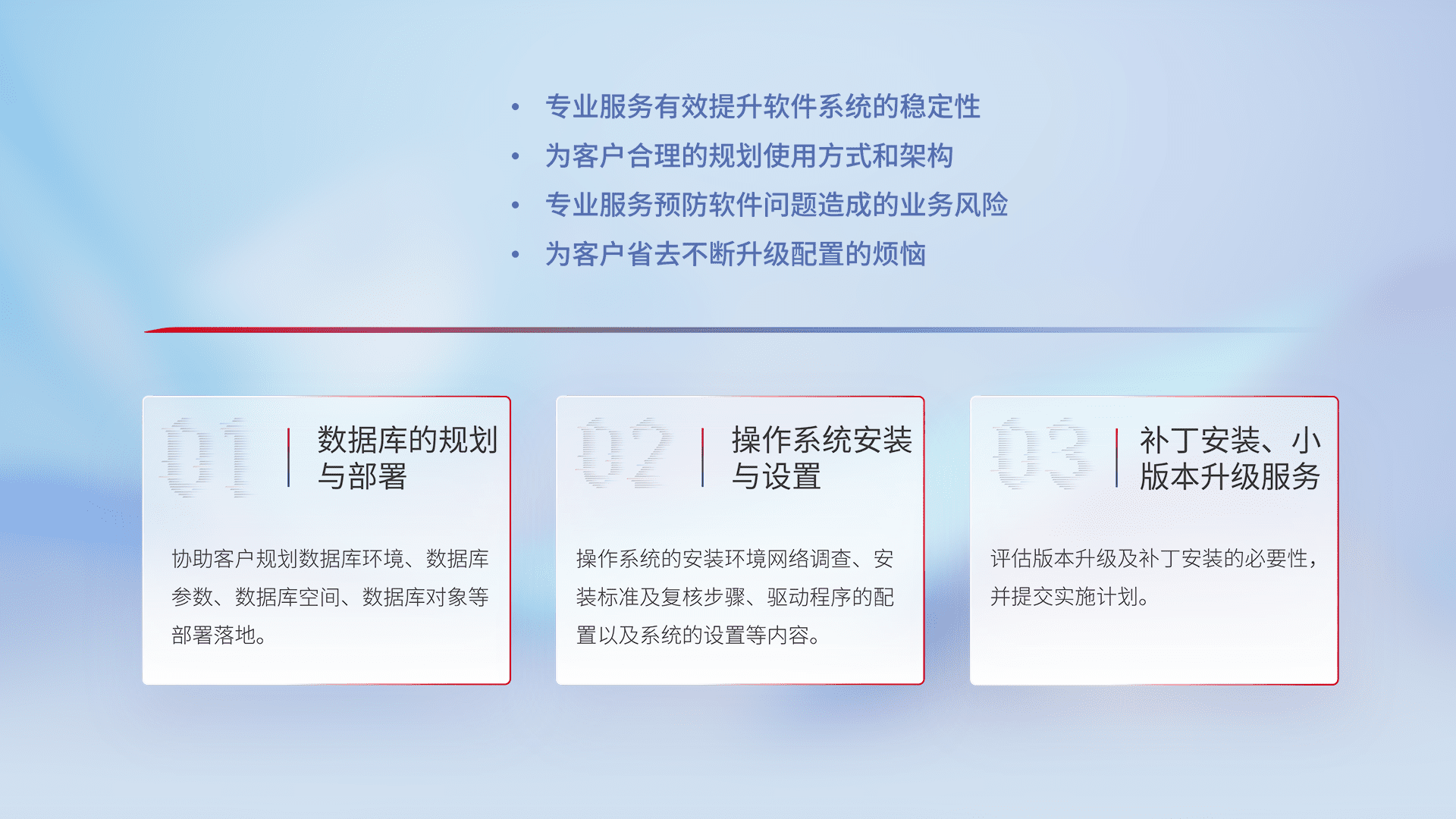 为客户提供软件规模升级、、、、快速部署、、按需配置的专业服务,,,从数据库的规划与部署到操作系统的安装与设置,,,再到补丁安装和小版本升级提供支持。。