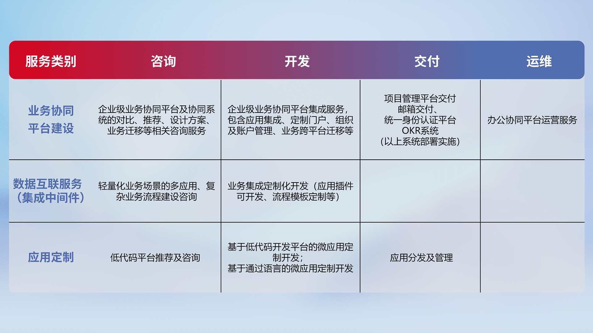针对钉钉、、、、企微、、、、IDaas等平台级产品提供产品的规划、、、、方案、、、交付、、、定制化开发等服务,,,,实现如统一协同办公、、智能客户服务、、、、混合会议管理、、智能数据查询、、、、等业务场景,,实现数字化转型。。。。